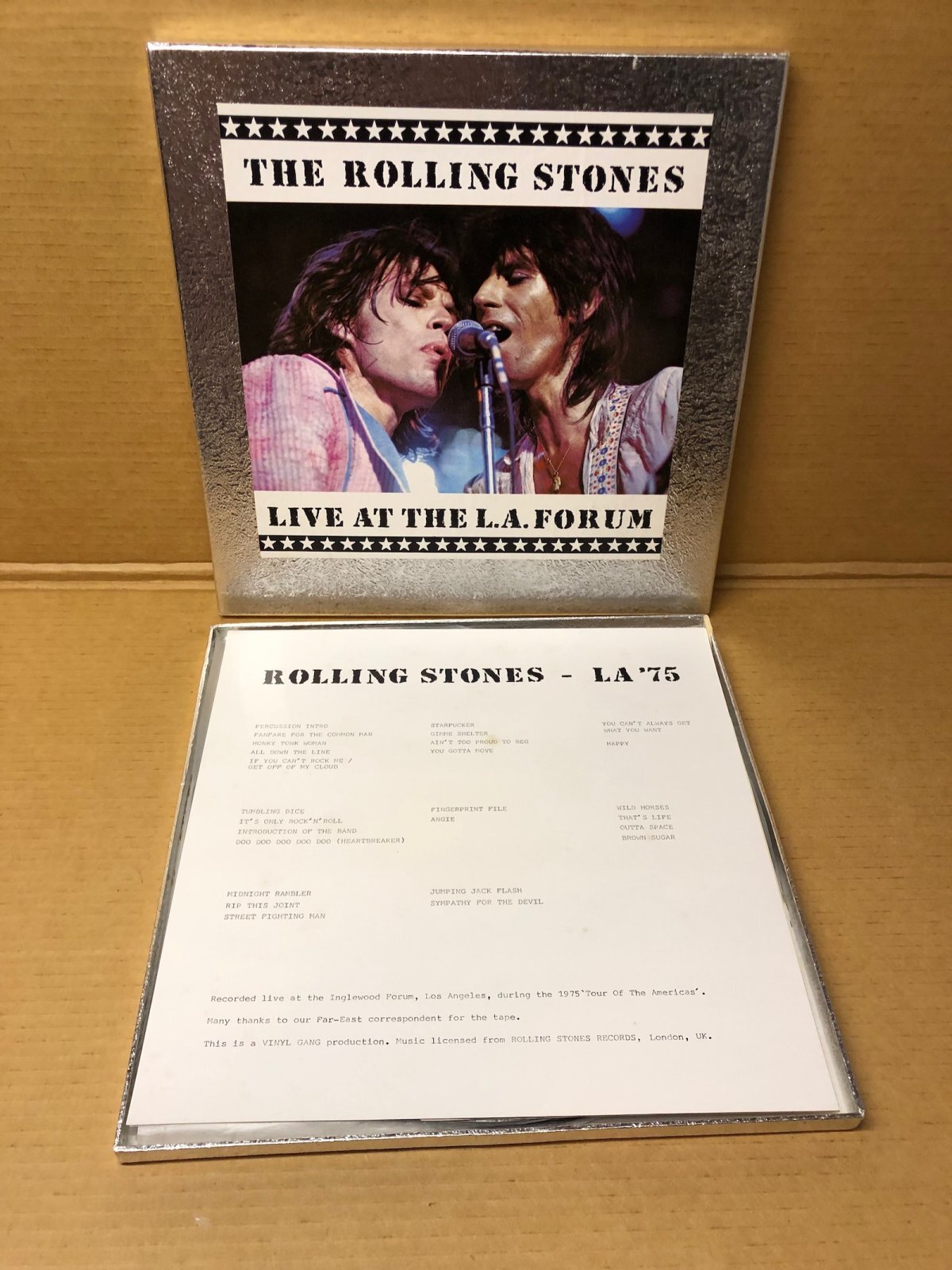 The Rolling Stones – Live At The L.A. Forum 1975- 4LP Multicolored Vinyl Silver Boxed Set. Recorded live in Inglewood, California, on 13 July 1975. Complete show. 4 LP multicolored vinyl. Guilty Records / Vinyl Gang. Silver boxed set. Vinyls are Mint. Box has small seam split on back (see images). Includes all inserts.